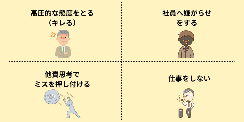 「今回うまくいかなかったのはお前のせいだろ!!」「こんなことも失敗するなら会社を辞めてもらって結構!」など、自分のミスを押し付けて社員を追い込んでいきます。